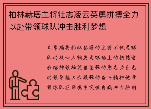 文章摘要:柏林赫塔的主将不仅是球队的核心...